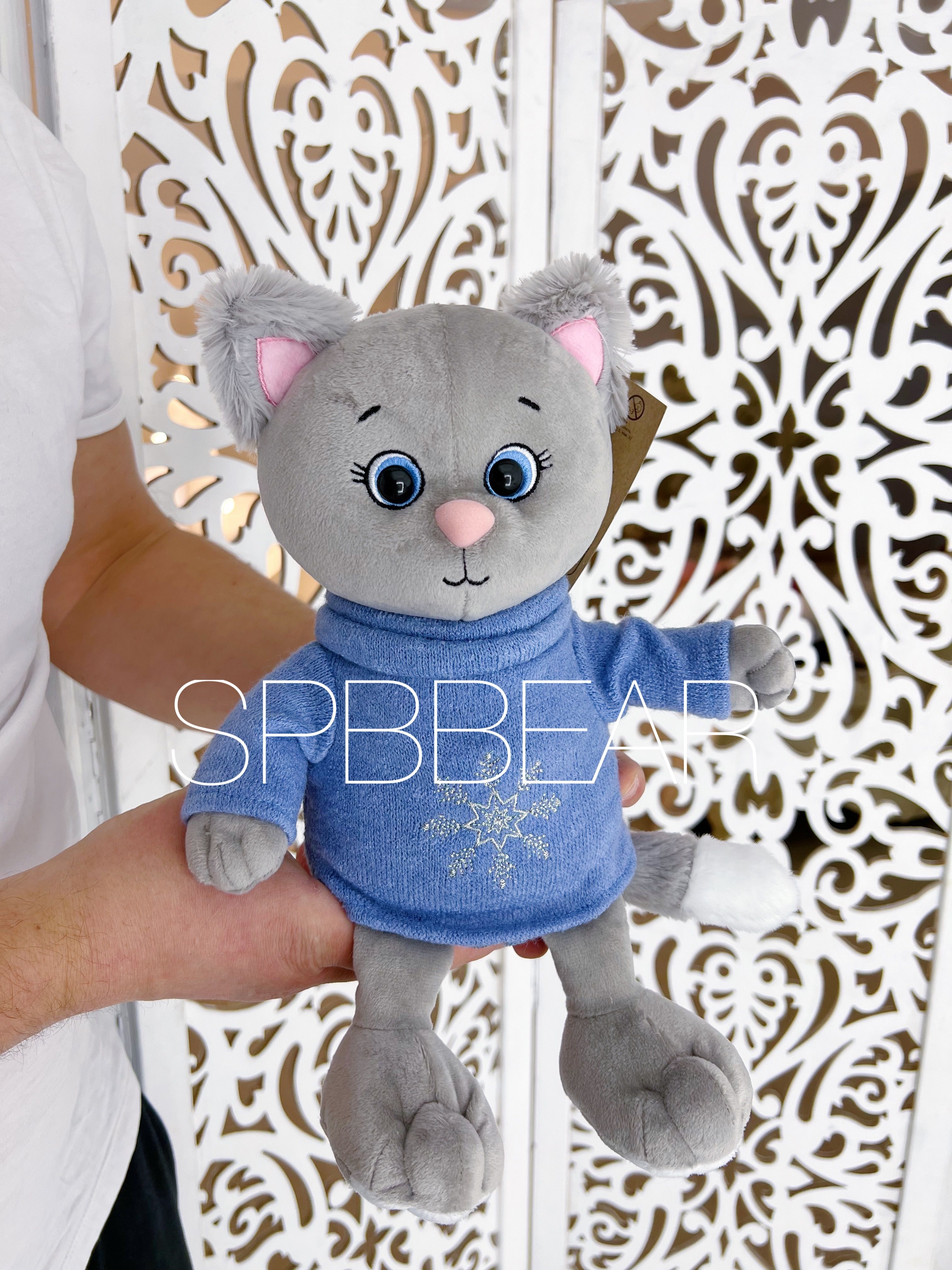 Знакомьтесь: «Грей». Этот котик поразит воображение. Приятный серый окрас, великолепная открытая улыбка, свитер придутся по вкусу любой представительнице прекрасного пола. Плюшевый кот станет отличным приятелем для дочки. Он составит компанию чтению, играм и даже танцам! А как приятно показывать котика друзьям. Он станет душой любой компании, сделав вашу принцессу самой счастливой. Любая девушка обрадуется такому подарку. Только представьте, как загорятся ее глаза при знакомстве с красавцем! Так приятно полежать, обнявшись тихими вечерами. Обратите внимание на великолепное цветовое сочетание в оформлении пушистого друга. Ненавязчивый серый окрас в сочетании с вставками на ушках и лапках – отличное дизайнерское решение.