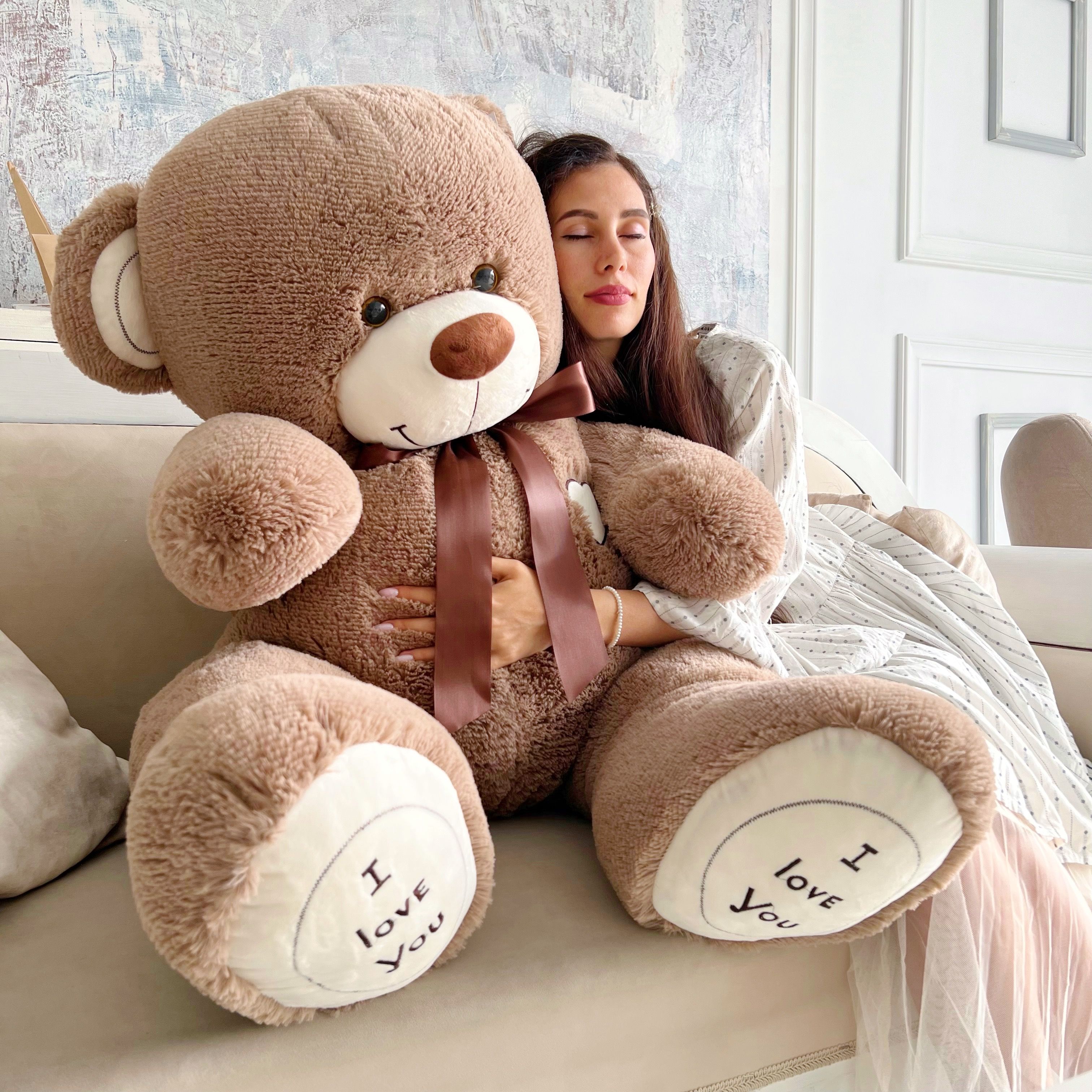 Чем подарок больше, тем лучше! Огромный плюшевый медведь способен сделать счастливой абсолютно любую девушку. Его смело можно назвать универсальным поздравлением. Если вы решили купить мишку любимой, то стоит выбрать большого. Кроме внушительного размера у него есть еще плюсы - трогательная внешность, отличное качество. Конечно, это подарок для особого случая, который лучше остальных сможет показать виновнице торжества ваши чувства. Игрушка класса «люкс» эффектно выглядит, приятна на ощупь. Нежная расцветка, бант, вышитое сердечко делают ее идеальным вариантом признания. Конечно, к медвежонку стоит заказать Подарочные корзины, а еще идеально подойдут фольгированные шары с гелием.
