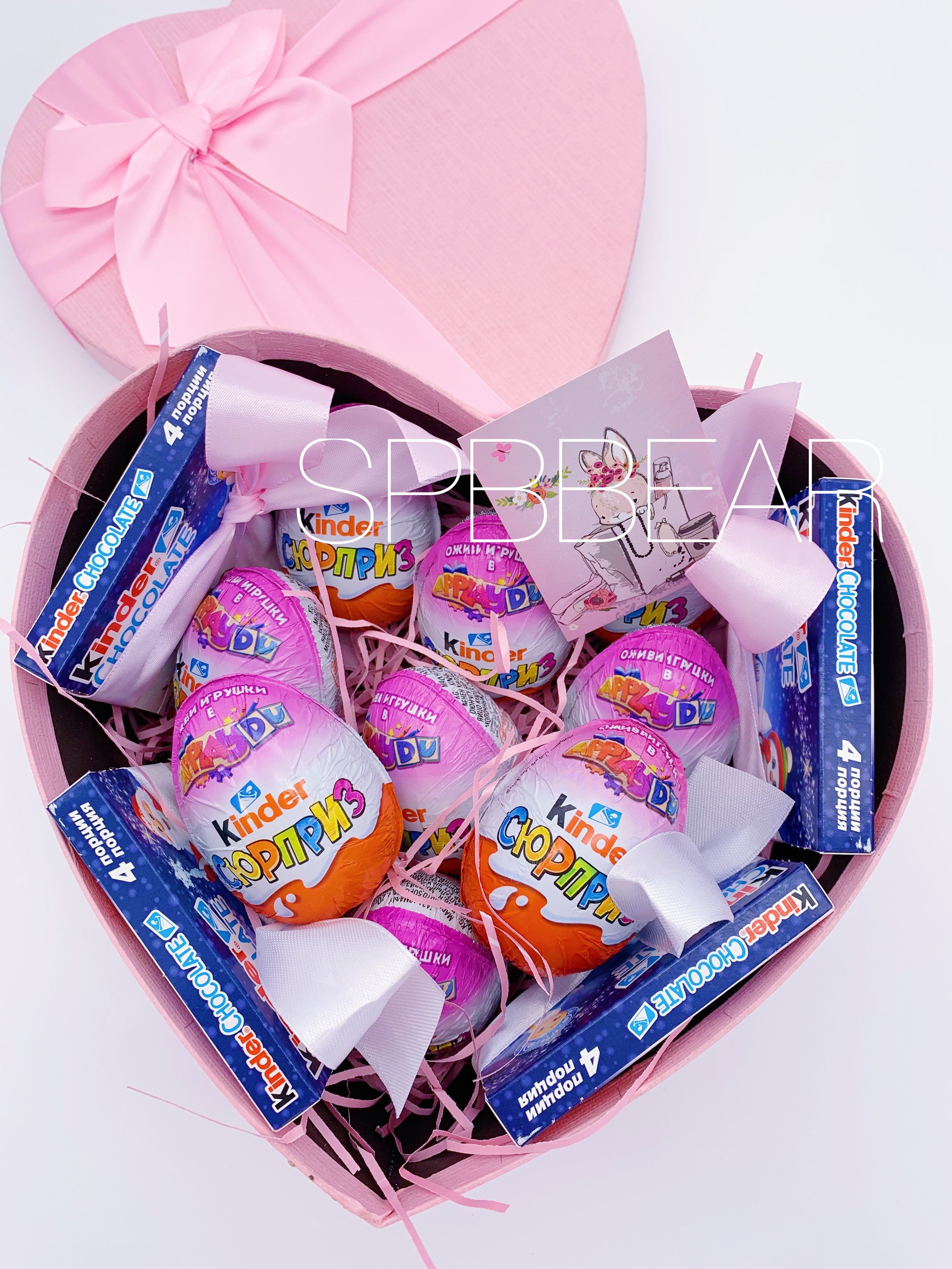 Большой подарочный бокс в виде сердца, наполненный киндер-сюрпризами, шоколадом и открыткой. Такой сладкий сюрприз непременно удивит и порадует всех без исключения!