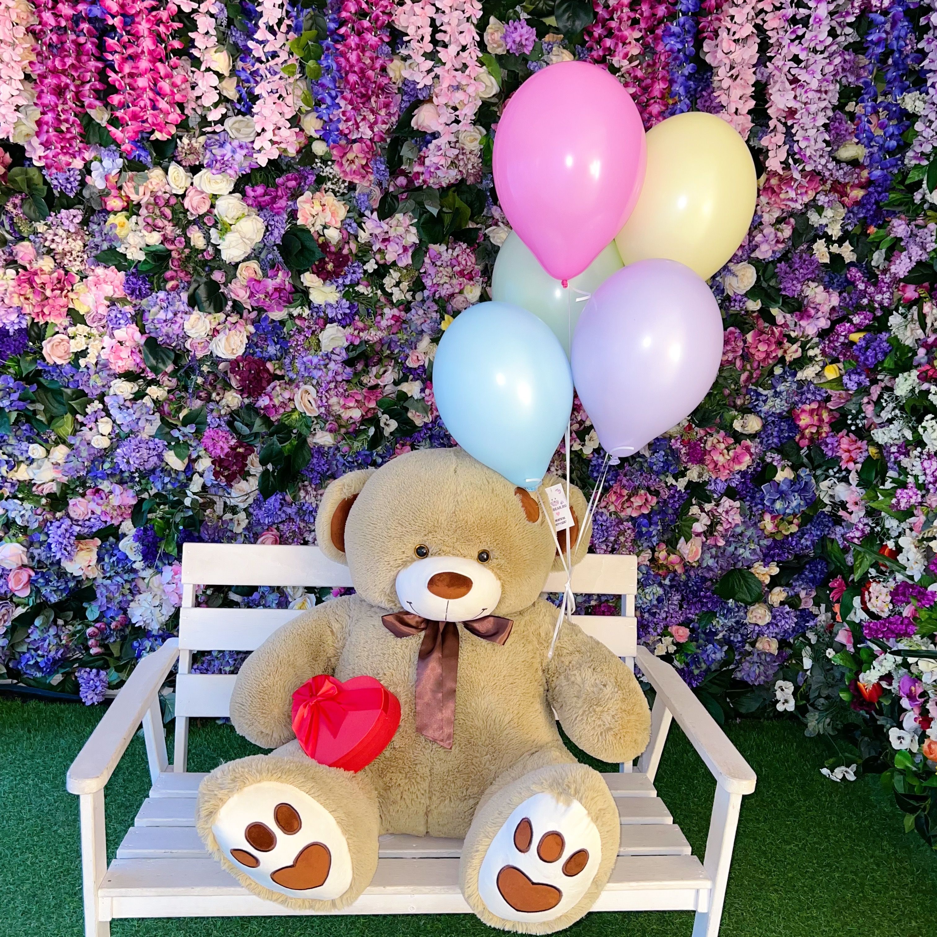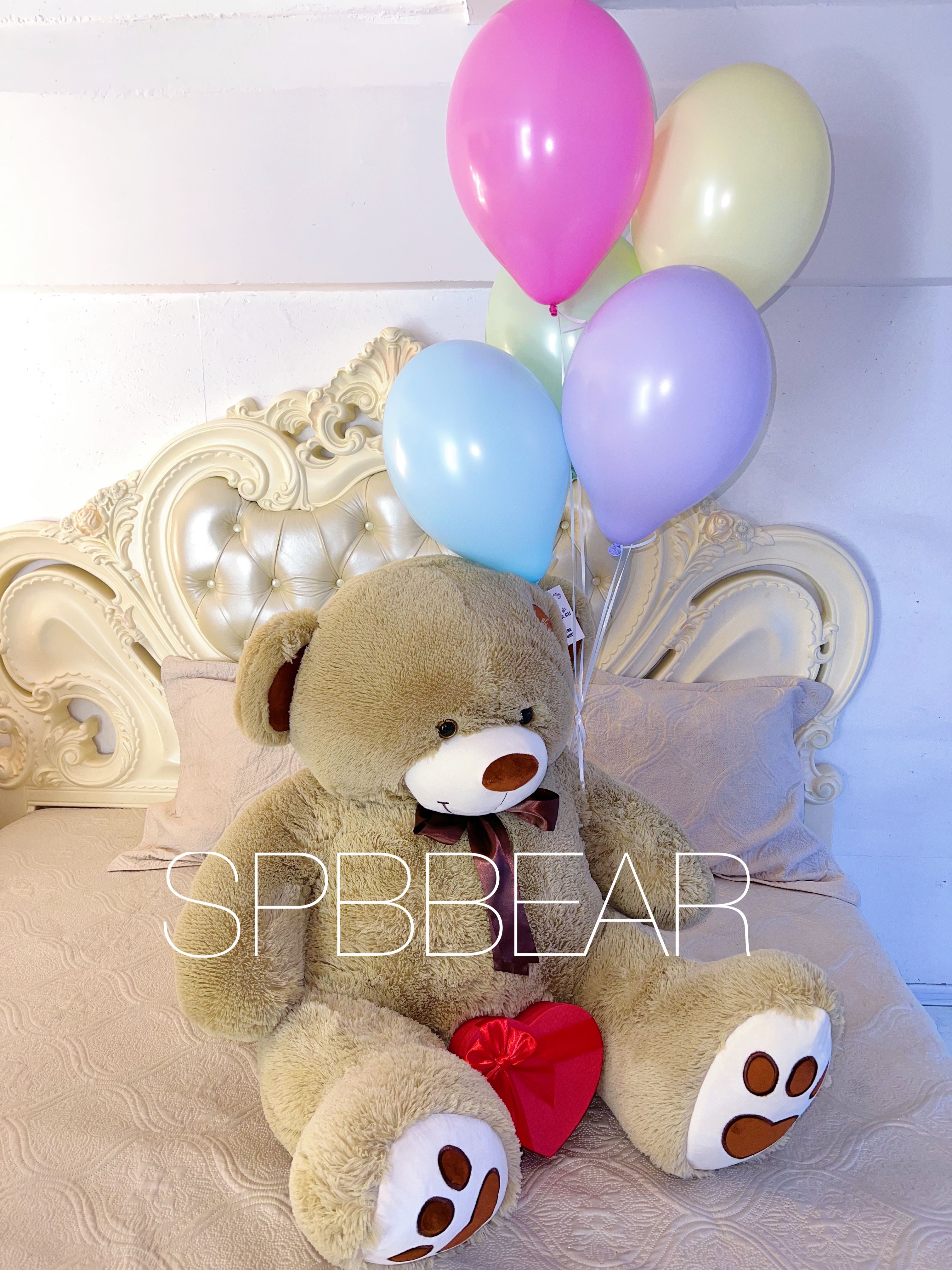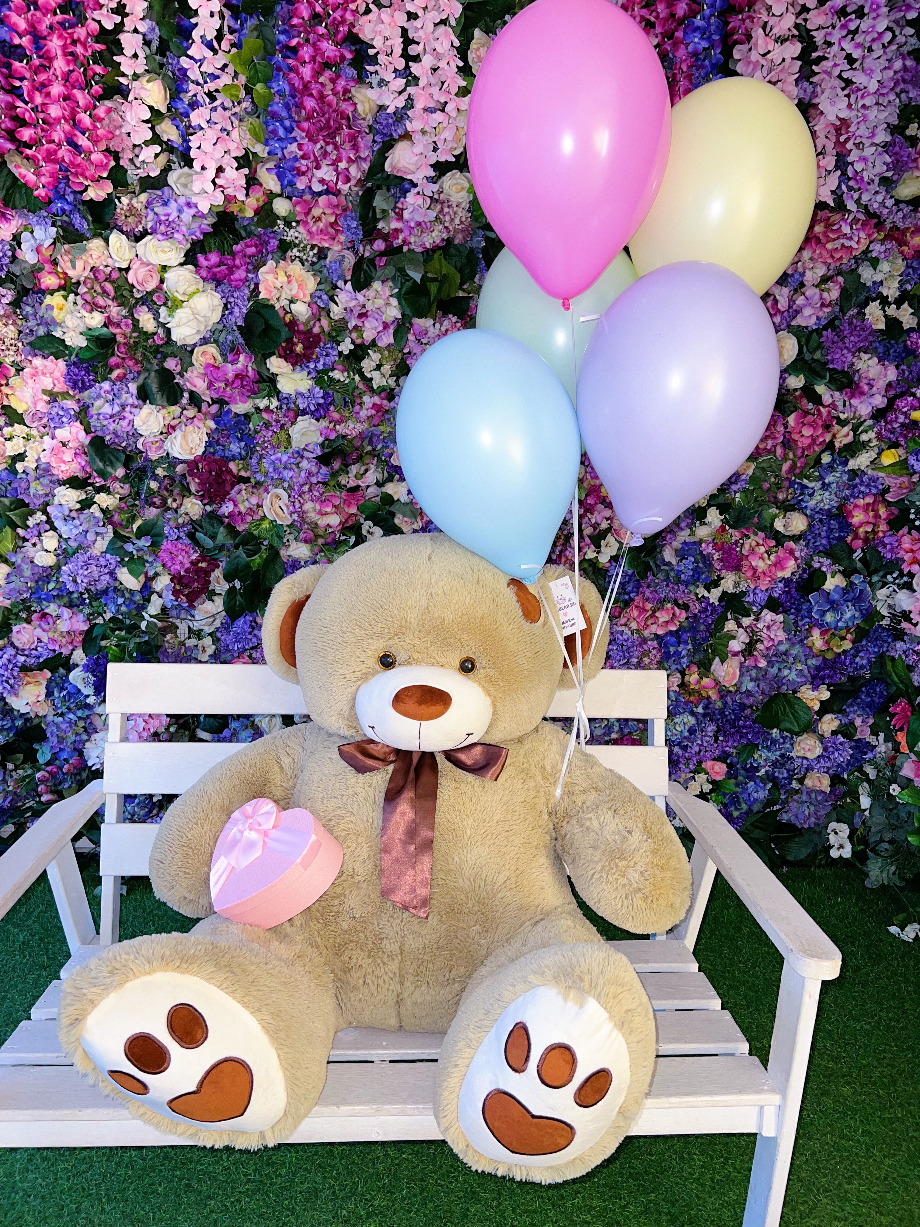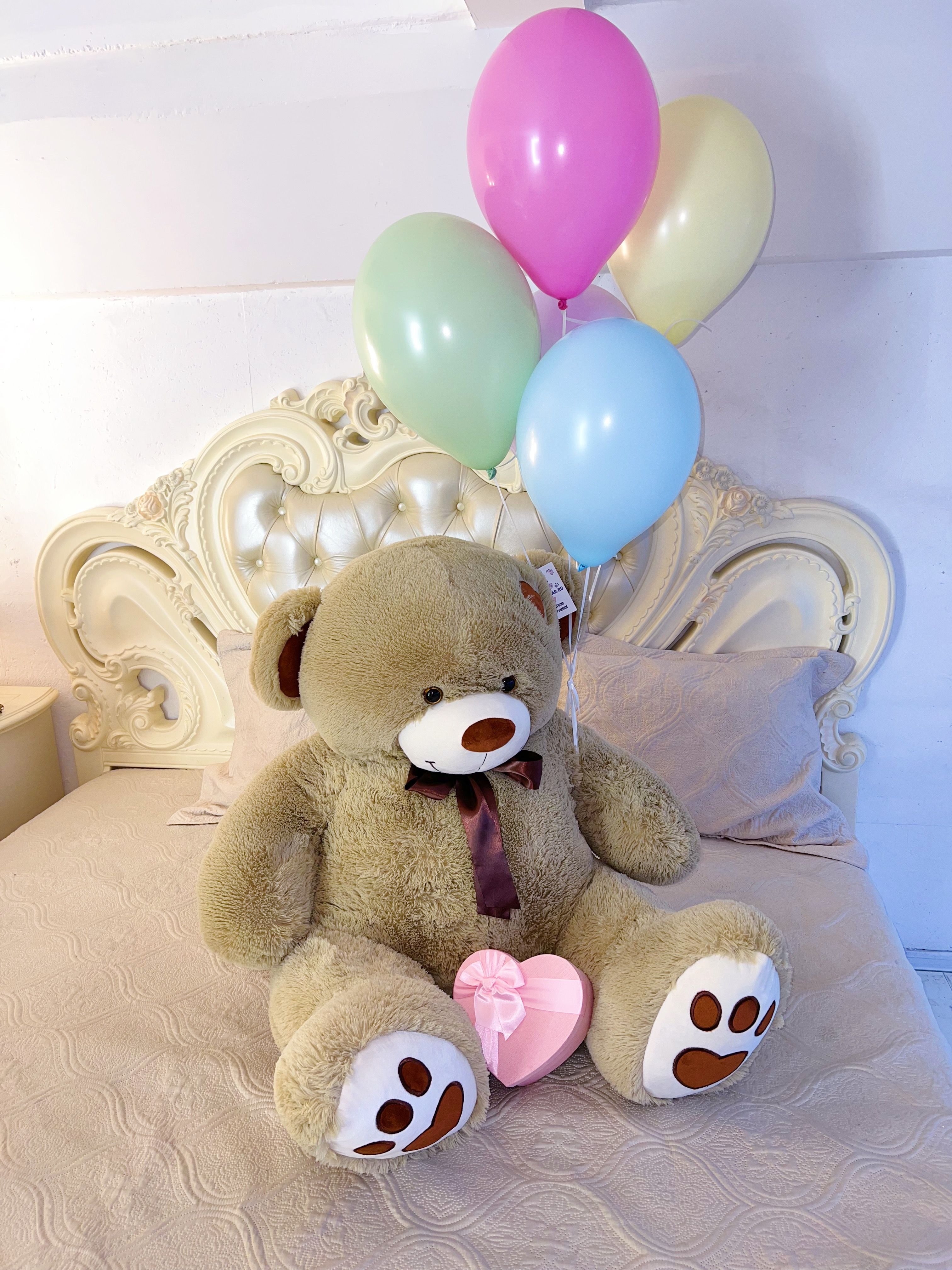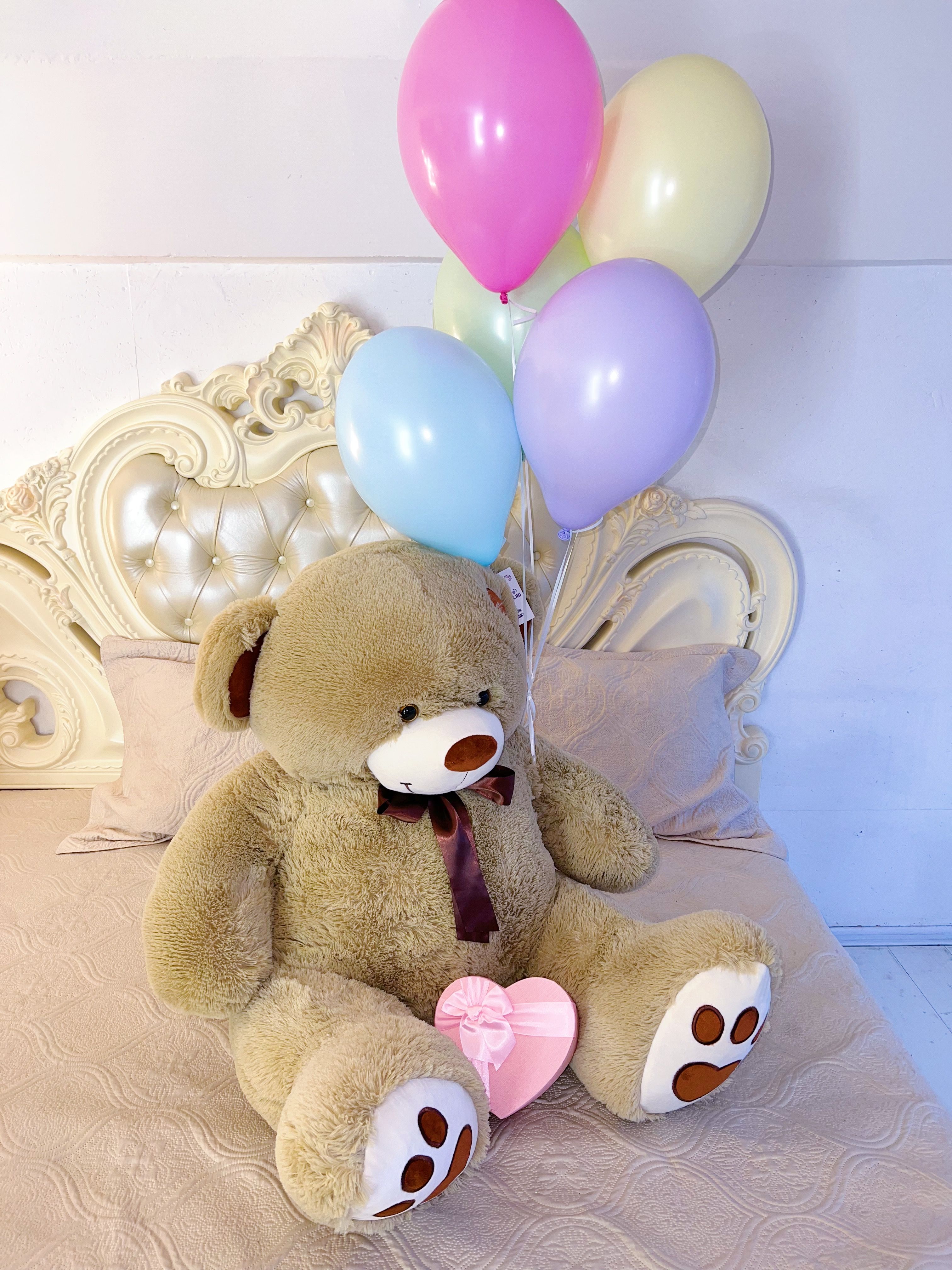 Великолепный плюшевый медведь размером 150 см станет главным героем любого мероприятия, вызывая улыбки и заряжая позитивом всех вокруг. Пять разноцветных воздушных шариков добавят красок и легкости, превращая каждый момент в яркое и запоминающееся событие.